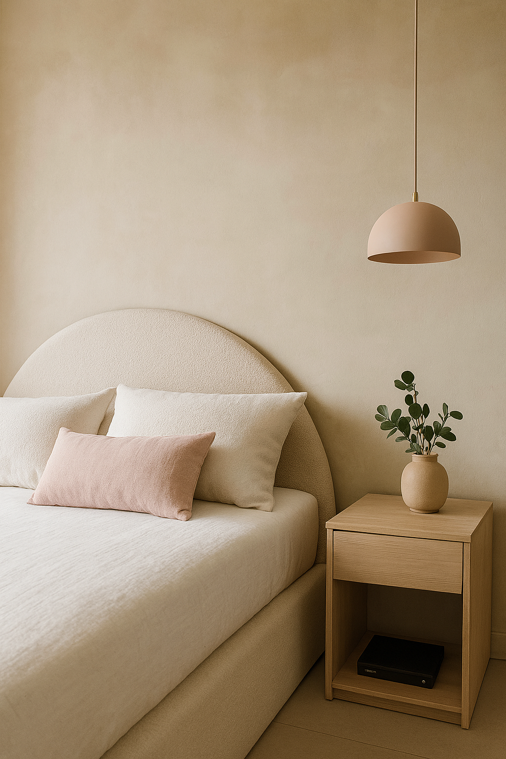 A cabeceira Arco une design contemporâneo com o aconchego do tecido bouclé, trazendo elegância e personalidade ao seu quarto.